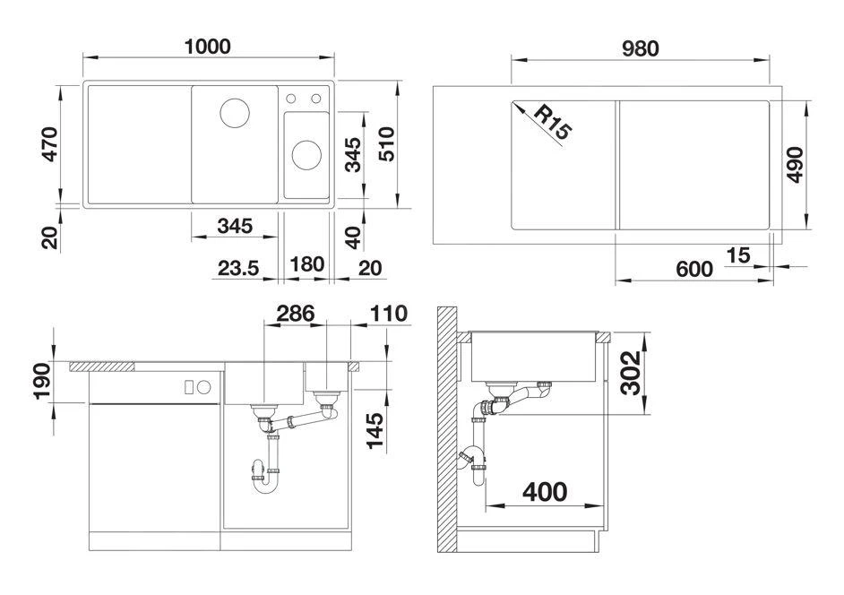 - Abmessungen (Spüle): 345 x 470 mm