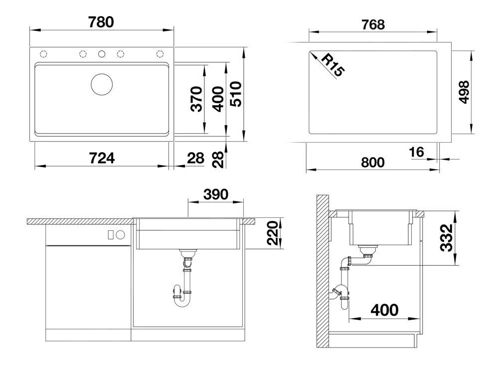 - Abmessungen (Spüle): 724 x 370 mm