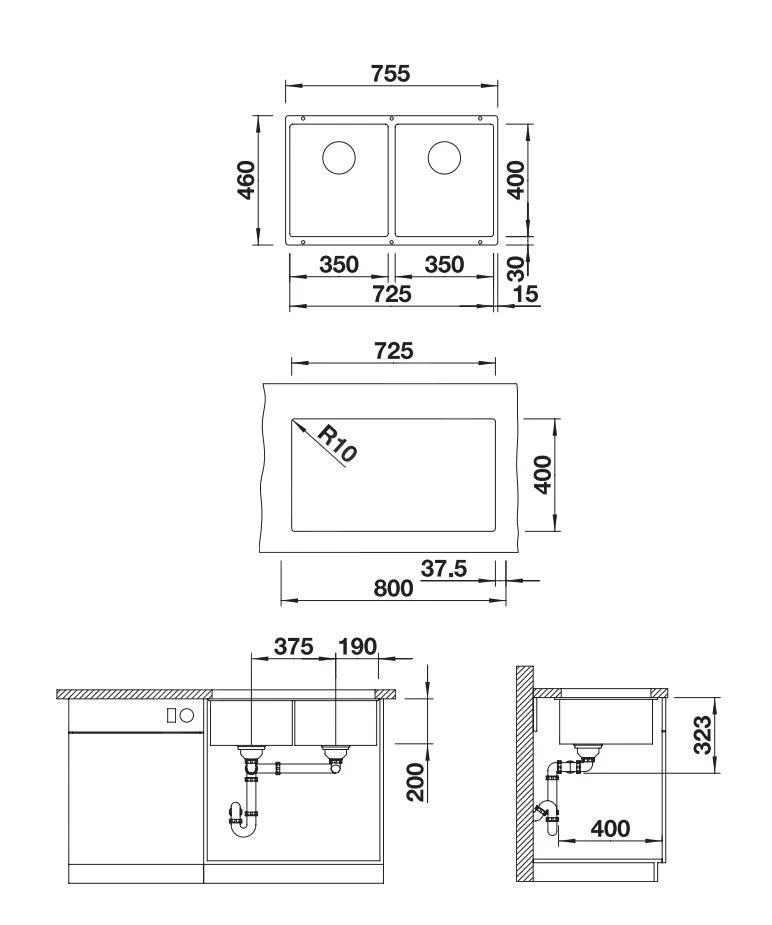 - Tiefe beider Spülbecken: 200 mm