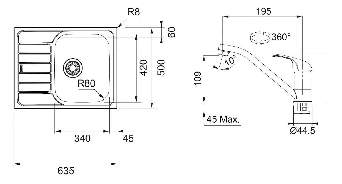 - platzsparendes Siphon 6/4“ mit Abzweigung zum Geschirrspüler